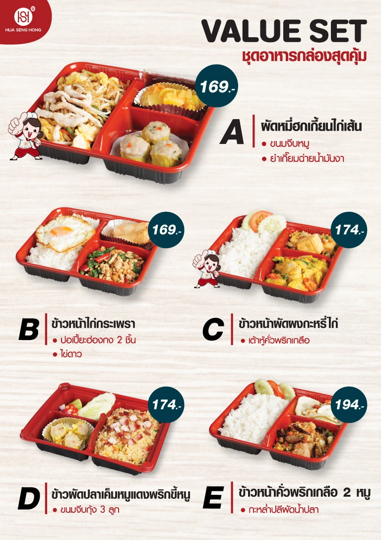 ‍ข้าวกล่องฮั่วเซ่งฮงของเรามีให้เลือกมากมาย ทั้งข้าวกล่องเมนูเดี่ยว หรือข้าวกล่องจัดเซต ซึ่งมีให้เลือกมากมายตามงบ Value Set (เซตคุ้มค่า), Premium Set (เซตสุดหรู) และ VIP Set (เซตพิเศษสำหรับแขกระดับ VIP)