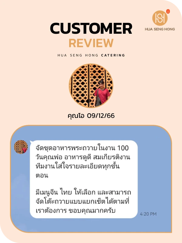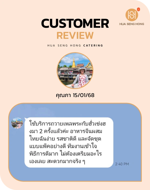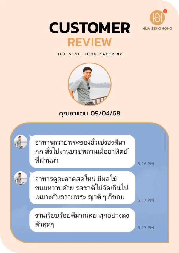 ให้งานบุญของคุณราบรื่นและสมบูรณ์ด้วยบริการ จัดอาหารถวายพระ จากฮั่วเซ่งฮง เราเชี่ยวชาญในการจัดเตรียม อาหารถวายพระ และ เมนูอาหารเลี้ยงพระเพล ที่คัดสรรมาอย่างดีตามประเพณีและหลักพุทธศาสนา